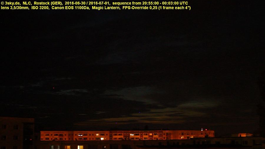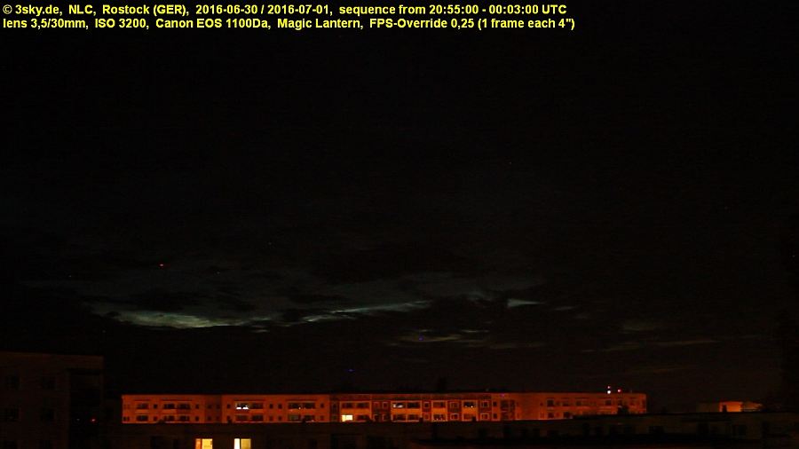 *period with automatic camera observations in sector 345°-020° (cloud gaps only...) (**with NLC, breaks because of clouds), at beginning max. height at least 10° in cloud gaps,***estimated brightness in periods during automatic movie probably brighter than 2; too much clouds for better documentation... |
