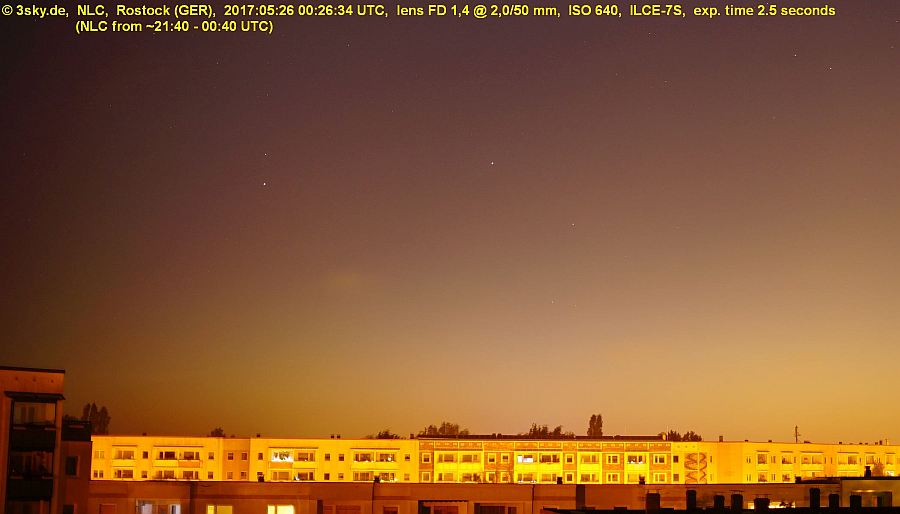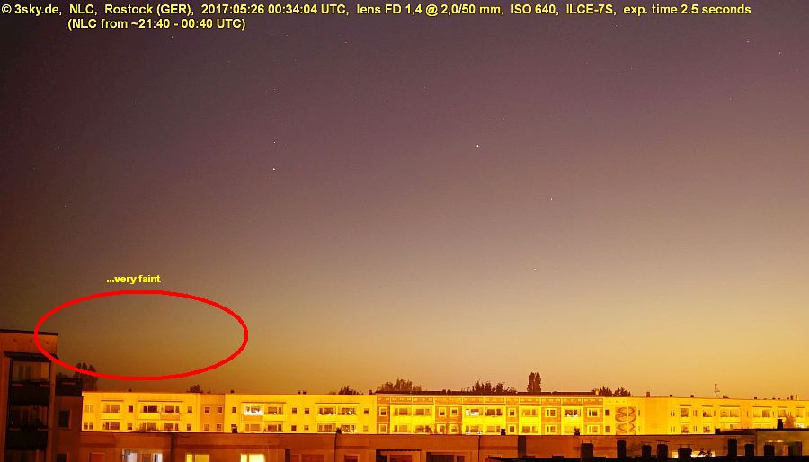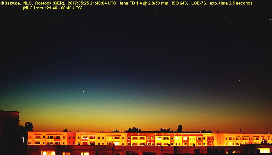 very good visibility including horizon; after 00:05 UT more and more low mist + stratus; *automatic camera observations ~ 345° - 020°; ** period with NLC, western border not to determine because of house in front; max.height in 350° - 355° from ~21:40-22:20 *** only very short visible control with tired eyes... |
