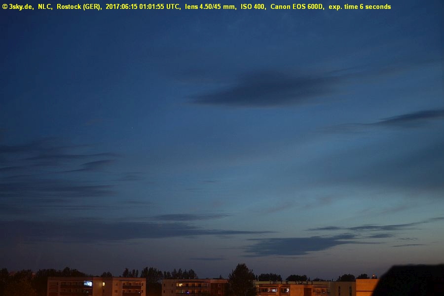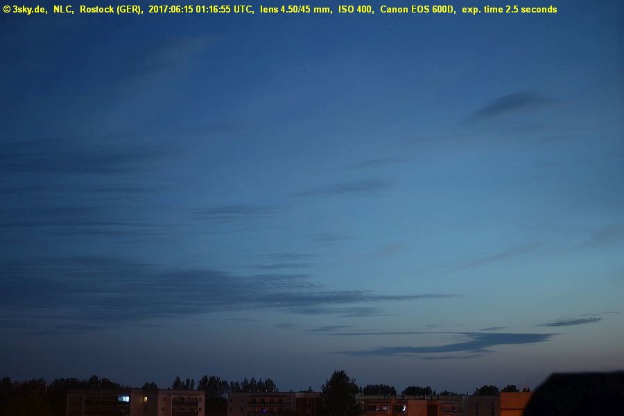 *315° - 325° **350° - 015° many Cirrus in the evening (partly 7/8), NNE-E a bit better *automatic camera observations ~300°-340° **automatic camera observations ~350°-020° ***maybe around 22:58 UT at AZI 005° short period in cloud gap NLC height 7° |
