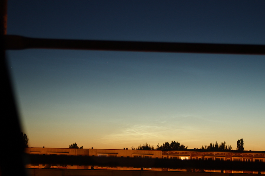 max. AZI to E = 015° in the morning *most of the time = automatic camera observations; Incredible + unbelievable: Just this day the landlord let put a scaffold in front of the buildings northern side! Have a good + high tripod but never used it in great height. Two legs on the low windowsill + one on the floor I could reach a height from around two meters where it was possible to catch a gap to view the sky with restrictions... |