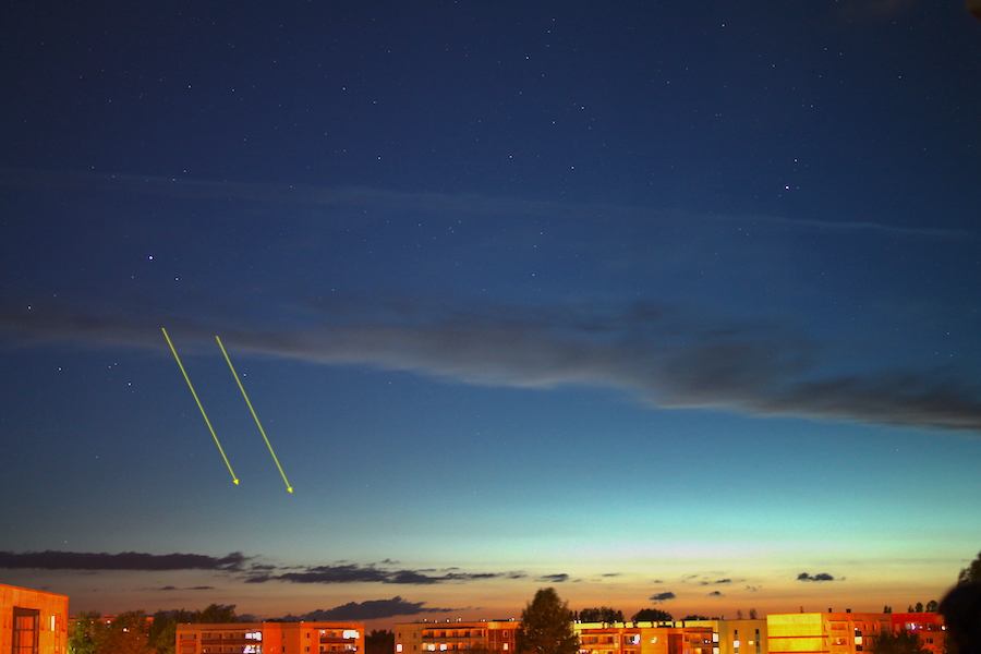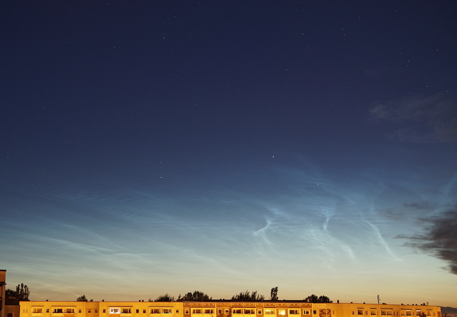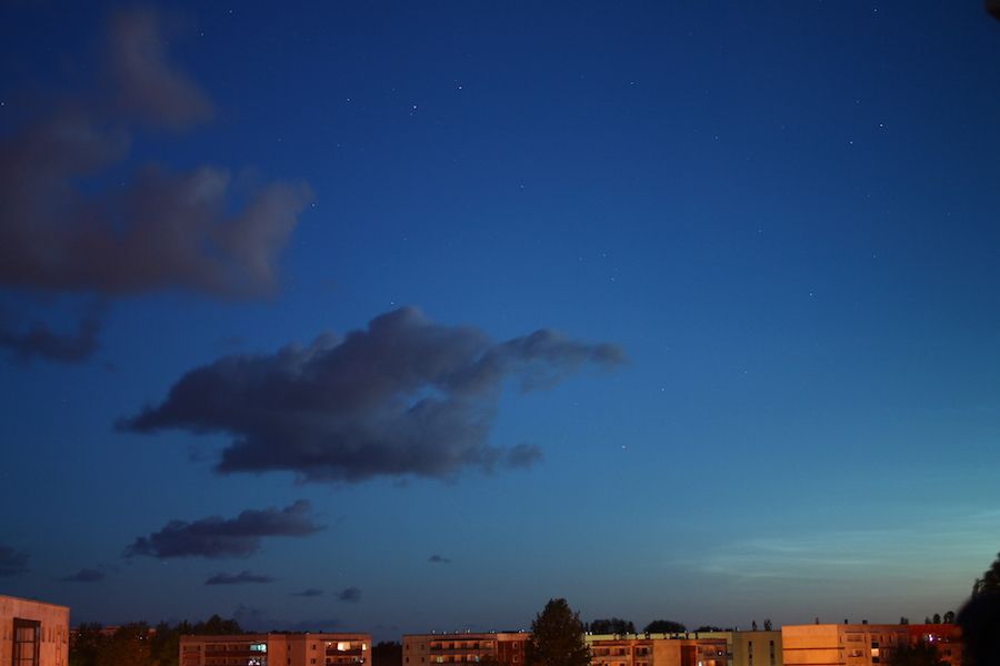 AZI morning: ~ 323° - > 017° (right edge of camera field); very good visibility including horizon but some scattered clouds, so later a small change of northern camera sector; * automatic camera observations ** during visual inspection around 00:25 UT by far the photograph that time is much more impressive compared to the view with the naked eye; next visual inspection at 01:45 UT: NLC faded away just before... |