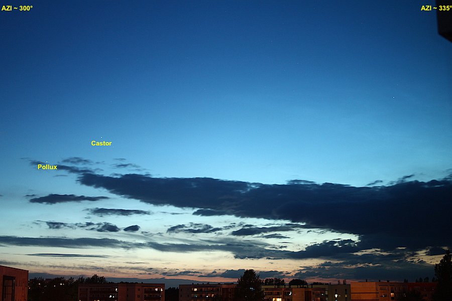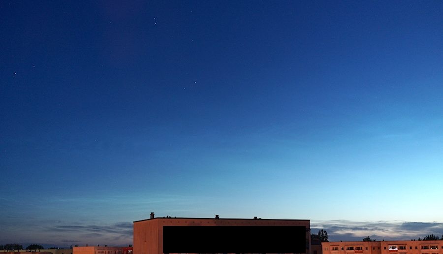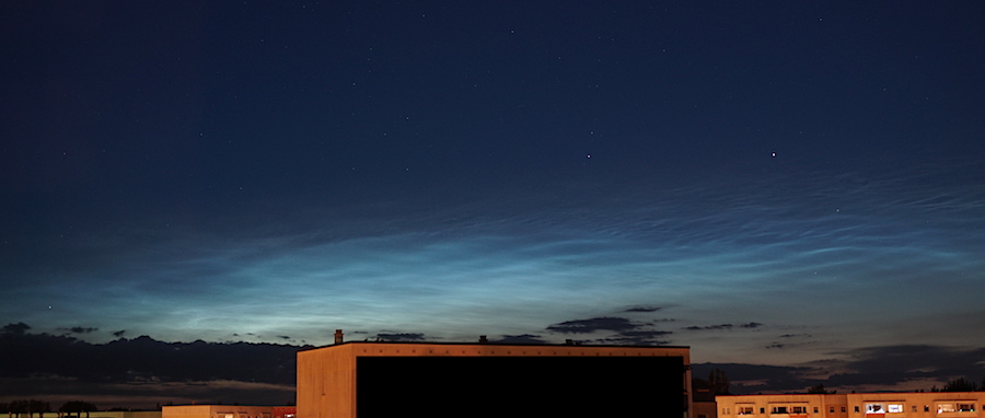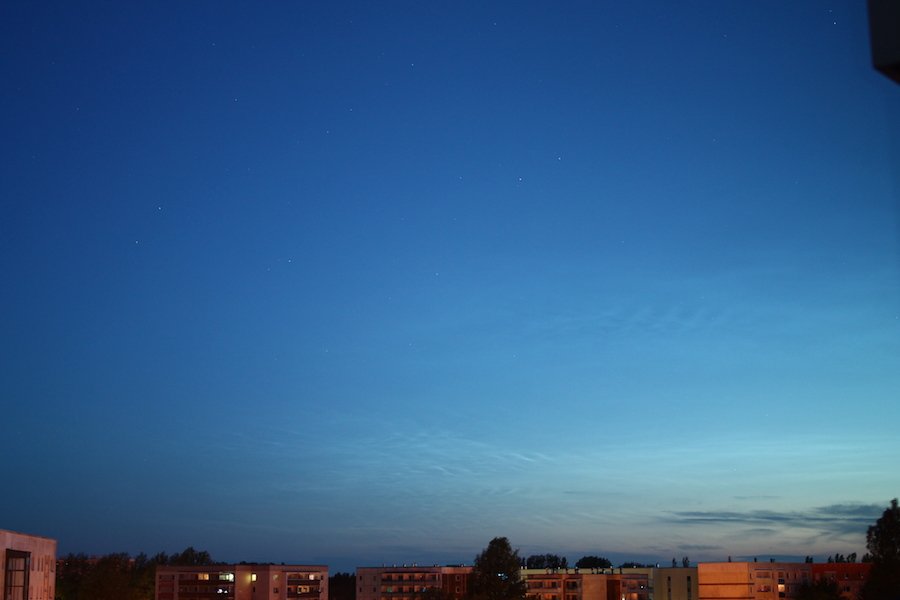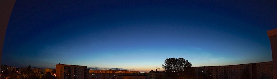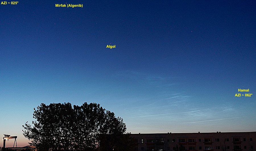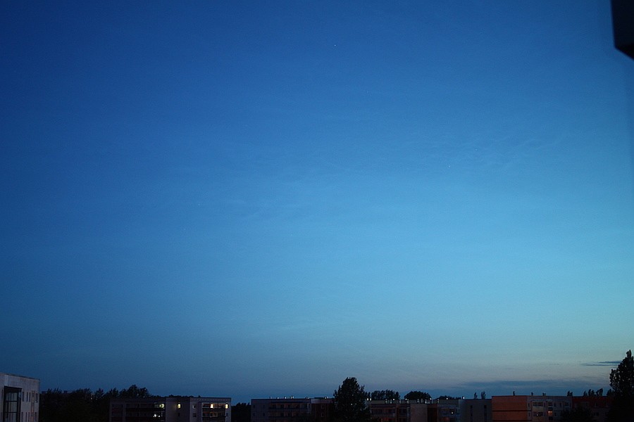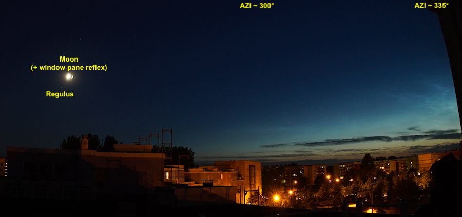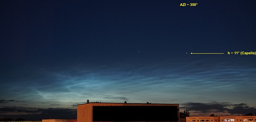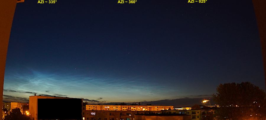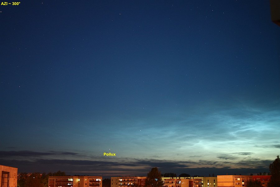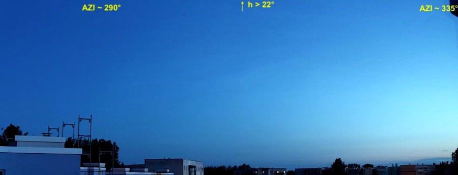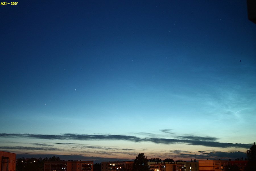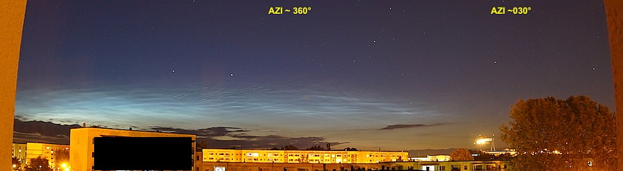 evening: 297 - 020 / later 025 morning: 290 - 065 at end of morning observation part; NLC evening start has been covered by clouds, later very good visibility with lasting clouds low above northern horizon; * automatic camera observations catched the NLC before the naked eye could see them + the cameras worked on during an observation break; NLC still visible at end of observation in WNW-NW-part + in NE-ENE-part, |