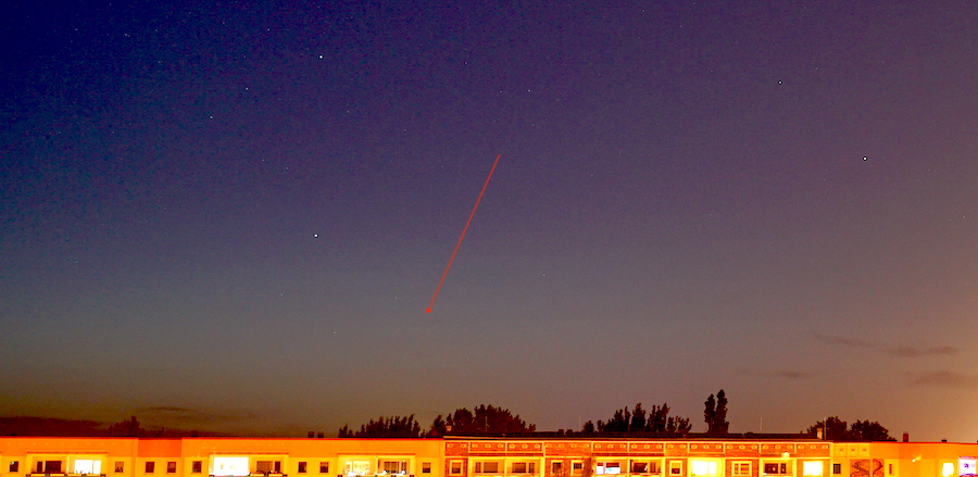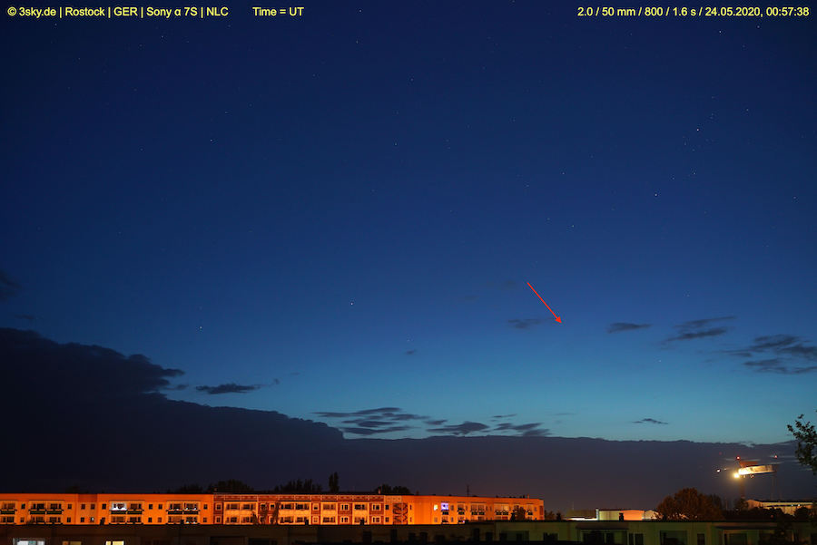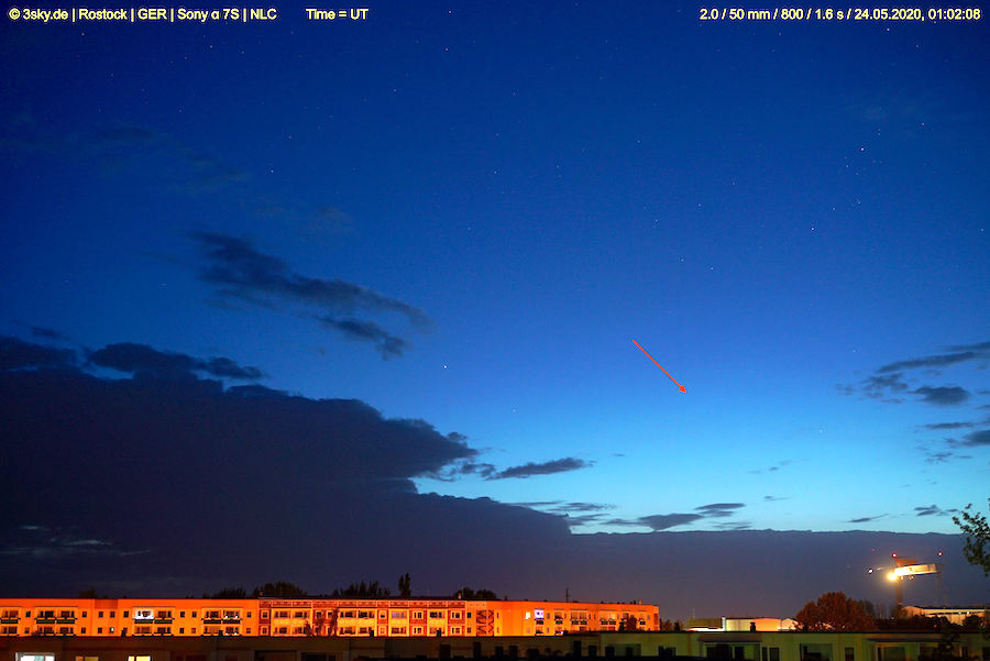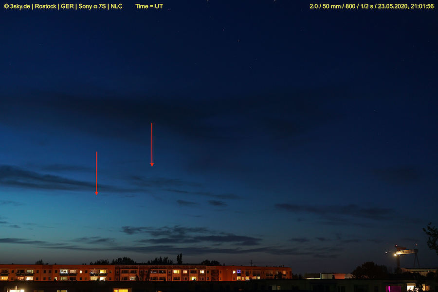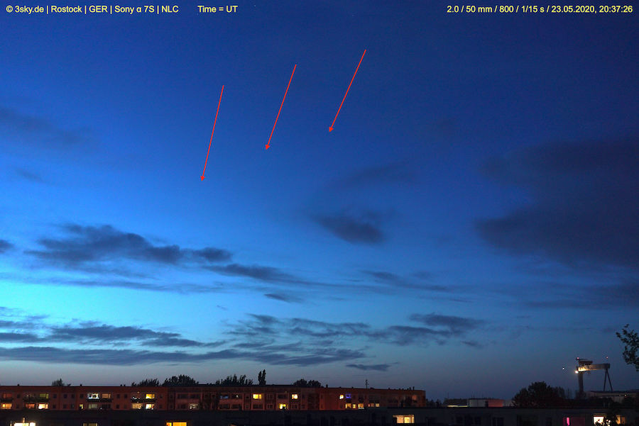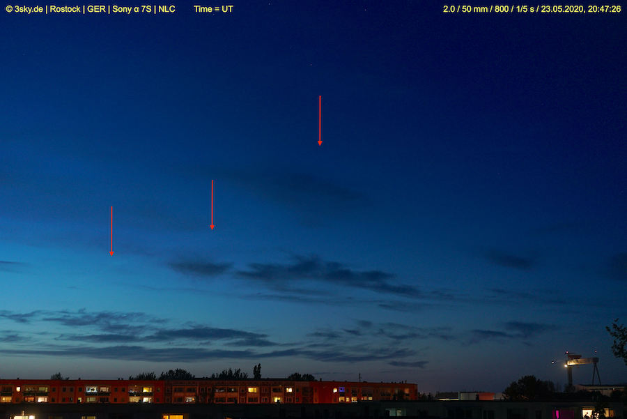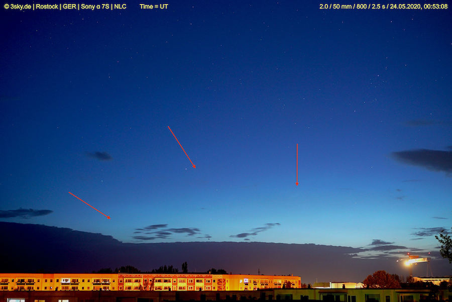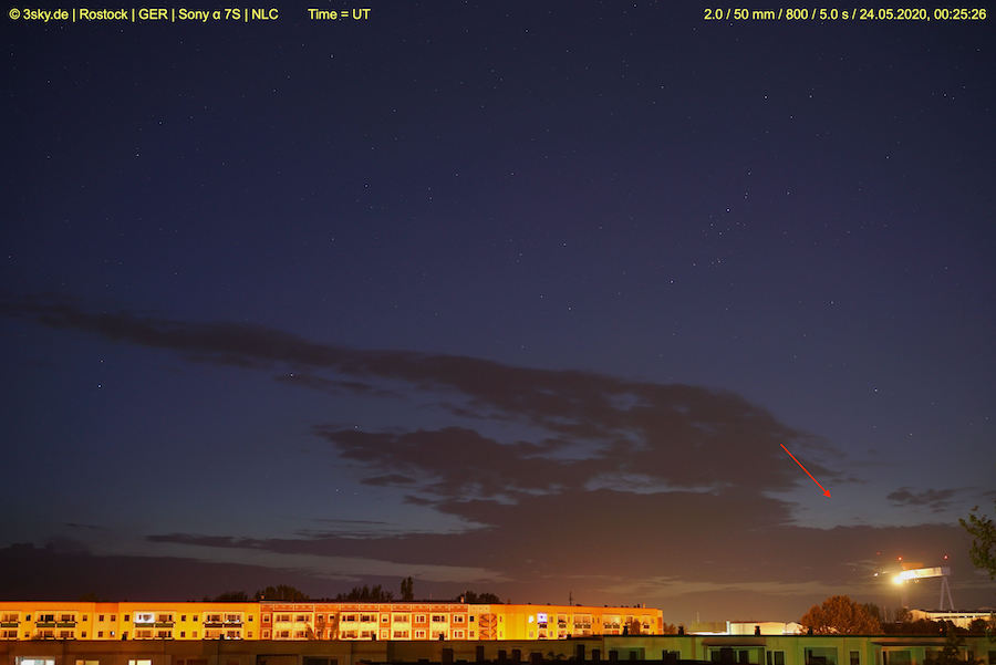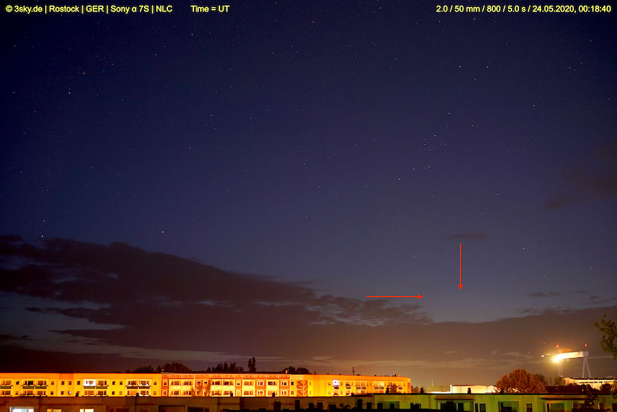1.: at least ~ 355° - 015° between clouds (*seen with binocular only + automatic camera detection) 2.: around N 3.: at least ~ 015° - 030° between cloud gap + tree ** automatic camera observations: ~ 350° - 030° 1.: 20:25 - 23:26 UT 2.: 00:10 - 01:49 UT |