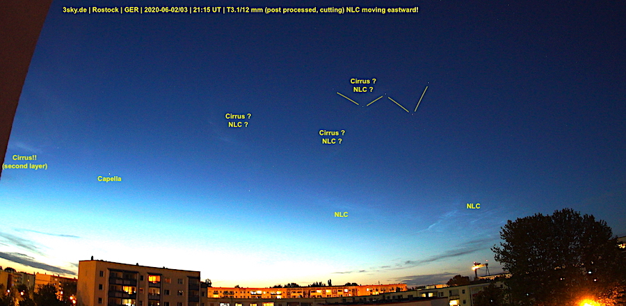 NLC moving eastward! AZI: evening: at least ~ 357° - 040° morning: at least ~ 010° - 015° * automatic camera observations: 346° - 026° but NOT betwwen 22:11 - 23:52 (no power) |