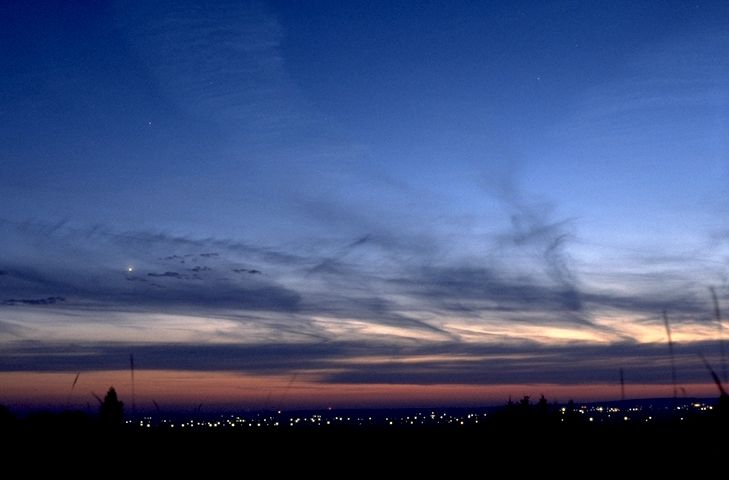 | NLC-Kontrolle am 08.07.2002 gegen 20:26UTC. Blickrichtung ca. Nordwest über das Donautal. Ort: Hohenried bei Ingolstadt / Oberbayern. Objektiv 4/50mm, t=3sec. auf Fujichrome Sensia 400. Links im "schwarzen Cirrus" ist Venus zu sehen. Höher über dem Horizont und hinter dem "schwarzen Cirrus" zeigen sich Cirren (hier zwei ältere verbreiterte Kondensstreifen) schwach nlc-ähnlich silbergrau. In Natur fiel der Unterschied noch etwas besser auf. |